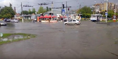 Автор видео, краматорчанин Валерий Монаенко, запечатлел район Крытого рынка, где на пересечении улиц Парковой и Юбилейной дорога и тротуры превратились в бурлящие после дождя и непроходимые реки.