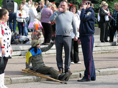 19 мая, когда краматорчане собрались на центральной площади в честь Дня вышиванки, Наталья Коваленко демонстративно уселась в центре многолюдного места, стараясь привлечь к себе внимание.